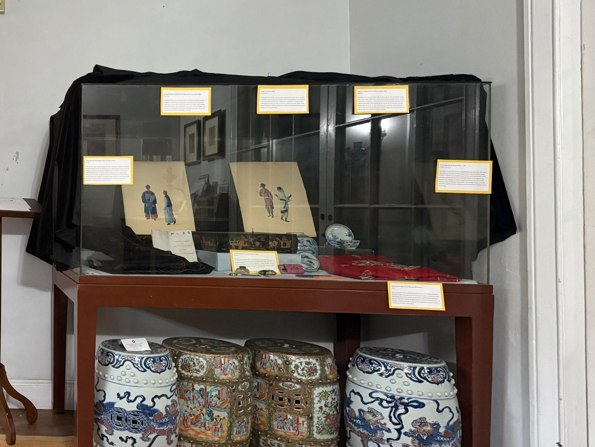 Display case at Wyck featuring Chinese export objects, including artistic drawings, porcelain tea sets, embroidered silk fabric, and a lacquered writing box